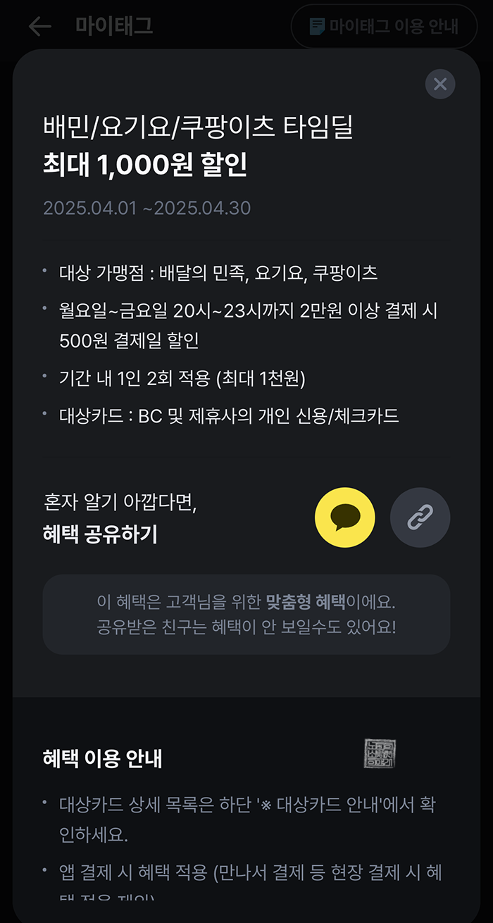 이렇게 저렇게 따지고 비교해도 이번 4월은 예스24 1천 원 할인을 받는 게 전부일 것 같지만, 그래도 1천 원도 땅에서 주울 수 없는 돈이니 즐거운 마음으로 책을 구매할 수 있다. 평소 BC카드를 이용한다면 2025년 4월을 맞아 오픈된 마이태그 할인 혜택을 놓치지 말자. 1천 원 할인도 분명히 우리에게 할인이다.