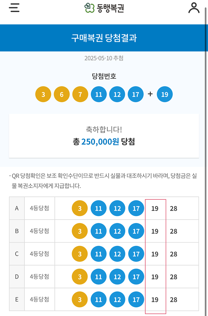 나는 로또를 구매할 때마다 수동으로 정한 번호 조합을 똑같이 기입한 수동 5천 원 한 장과 나머지는 모두 운에 맡긴 자동 5천 원을 구매한다. 이번 1171회에서 당첨된 복권을 살펴보면 3, 11, 12, 17 네 개의 당첨 번호가 맞았을 뿐만 아니라 보너스 번호 19도 일치했다. 즉, 운이 좋았다면 로또 1171회 2등에 5회 당첨이 될 수 있었다.