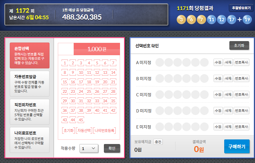 오늘 일요일 오후부터 다시 구매할 수 있는 로또 1172회를 구매할 때는 재차 수동으로 똑같은 번호 조합 5개를 기입한 이후 자동 5천 원을 구매할 생각이다.
