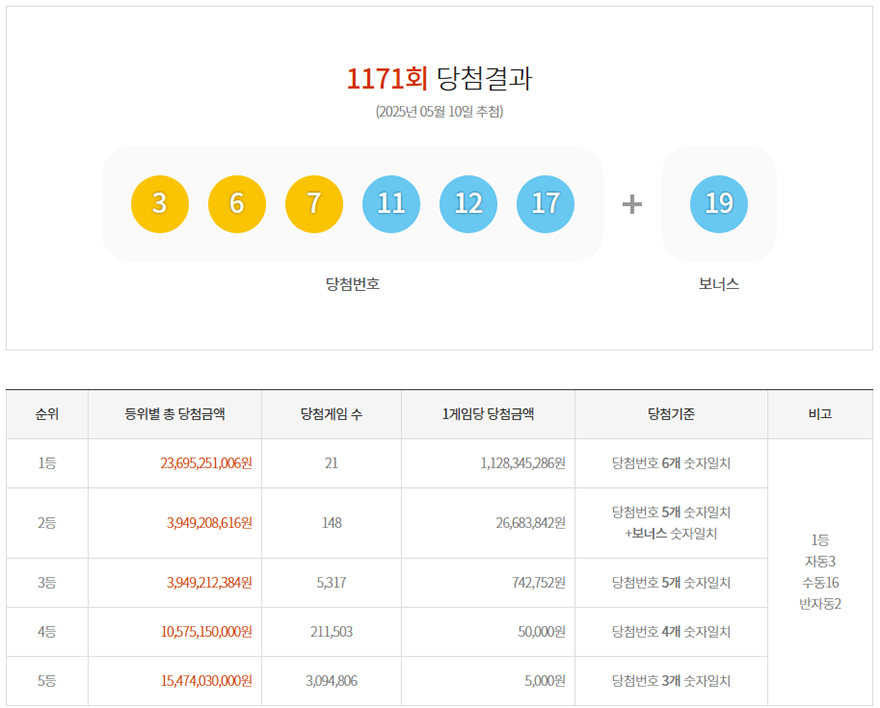 2025년 5월 10일을 맞아 공개된 로또 당첨번호는 3, 6, 7, 11, 12, 17 여섯 개의 숫자로 1등 당첨번호를 맞춘 사람은 무려 21명이나 되었다. 여기서 놀라운 건 21명 중에서 수동으로 맞춘 사람이 16명, 자동으로 1171회 당첨번호를 손에 넣은 사람이 3명, 반자동으로 당첨번호를 손에 넣은 사람이 2명이라는 점이다.