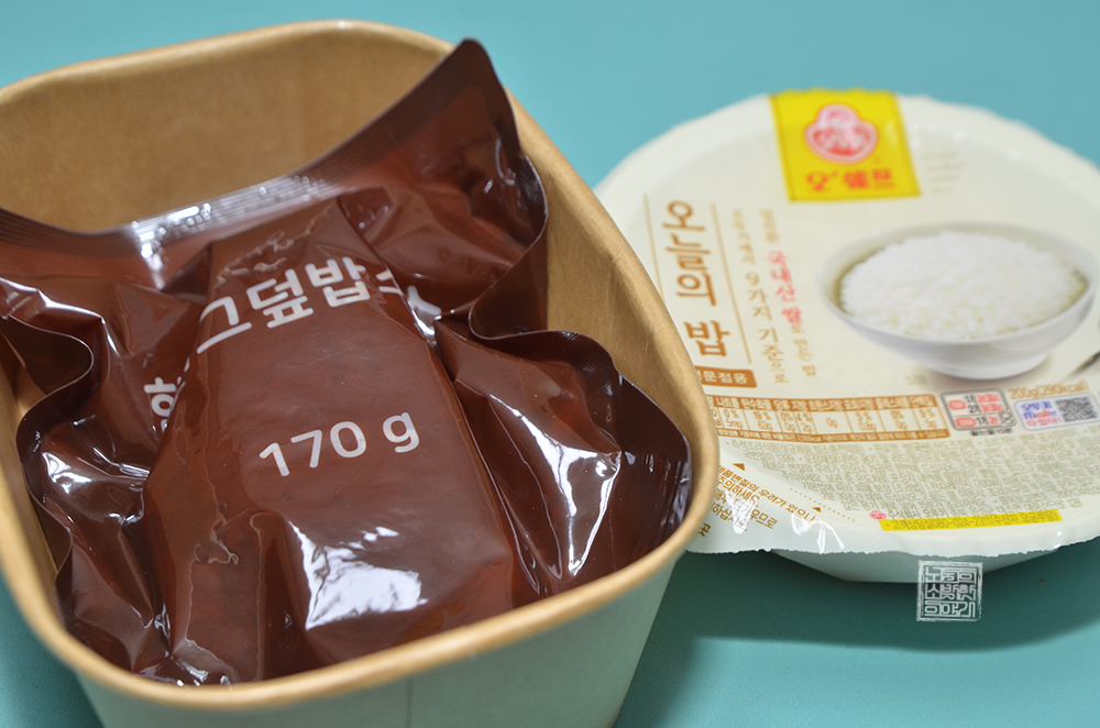 나는 어차피 버려야 하는 버터함바그 덮밥 전용 용기는 깔끔하게 버리고 싶어서 일부러 집에 있는 국그릇을 이용했다. 오뚜기 즉석밥을 먼저 옮긴 이후 함바그와 소스를 함께 풀어주니… 급식소에서 먹던 그 향기와 함바그의 모습을 볼 수 있었다. 아마 남학생이라면 급식 아주머니께 "소스 좀 많이 주세요~."라고 부탁했던 적이 있을 것이다.