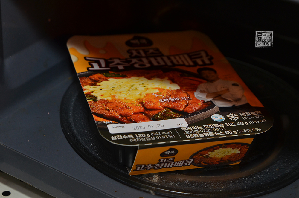 치즈 고추장바베큐 조리 방법은 대단히 간단하다. 우리가 편의점에서 판매하는 간단 식품을 구매해서 먹는 이유는 전자레인지만 있으면 어떤 음식이라도 간편하게 조리해서 먹을 수 있다는 점인데, 치즈 고추장바베큐는 용기에 고기를 넣고 1,000W 기준 1분 동안 가열을 하면 된다. 물론, 700W일 경우에는 조금 더 시간이 필요했다.