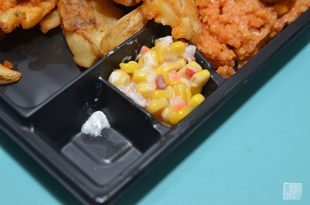 다른 밑반찬으로는 오이피클과 함께 콘샐러드가 함께 들어가 있었다. 오이피클과 소스는 전자레인지로 데우기 전에 미리 빼달라고 적혀 있으니 주의하자. 이런 신선(?) 제품에 속하는 차갑게 먹어야 하는 밑반찬을 가끔 통째로 전자레인지에 넣어서 돌리는 경우가 있는데, 그렇게 하면 맛도 떨어지고 약가 문제가 생길 수도 있다.