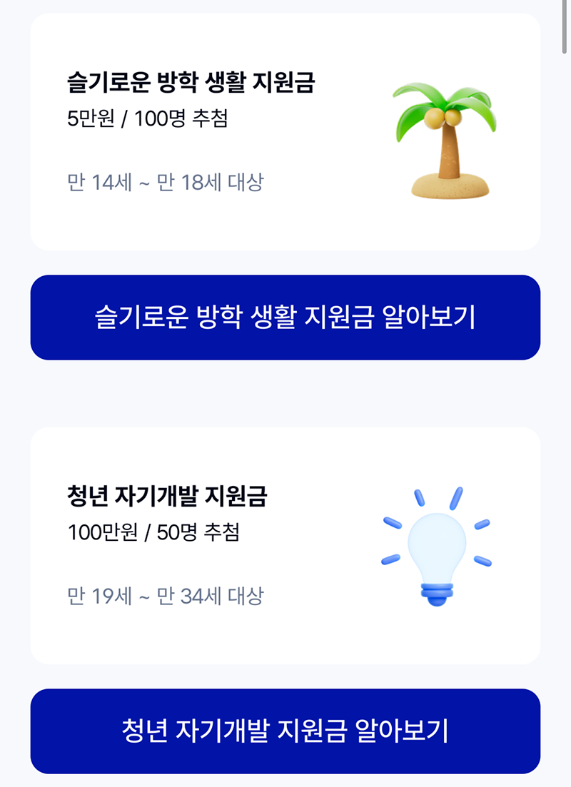 여기서 정확히 100만 원의 이벤트 지원금을 받을 수 있는 건 청년 자기개발 지원금으로, 만 19세 이상 만 34세를 대상으로 하는 이 이벤트는 충분히 우리가 노려볼 수 있다고 생각한다. 지금 이 글을 쓰는 나는 생일이 아직 지나지 않은 덕분에 만 34세로 아슬아슬하게 청년 자기개발 지원금 이벤트에 참여할 수가 있어서 다행이다.