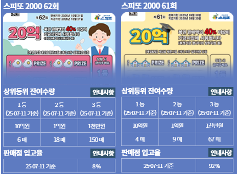 스피또2000 62회 판매 시작 61회 판매점 입고율 1등 잔여수량 살펴보니