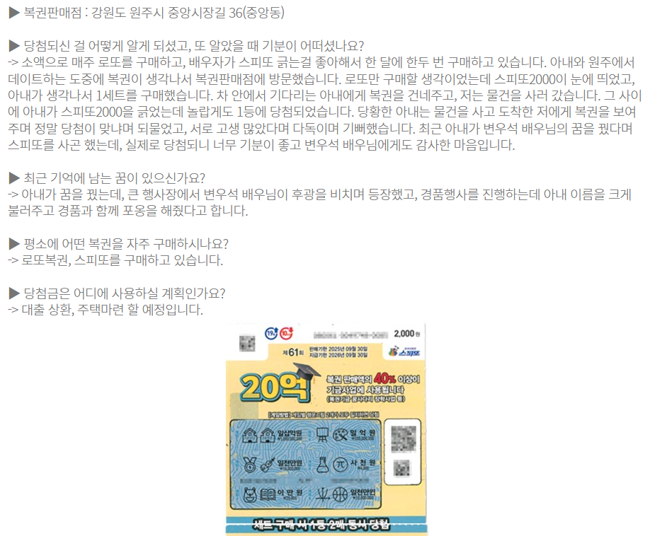 동행복권 홈페이지를 통해 확인할 수 있는 당첨현황과 인터뷰를 보면, 스피또2000 61회에서 가장 최근에 당첨된 사람은 지난 6월 11일(월)에 인터뷰를 했던 사람이다. 당시 당첨자는 아내가 큰 행사장에서 배우 변우석을 만나 경품 당첨에 되는 꿈을 꿔서 꾸준히 스피또 복권을 구매했다고 한다. 그러다 덜컥 1등이 당첨된 것이다.