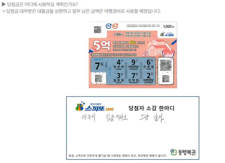 복권 판매액의 40% 이상이 기금사업에 사용된다고 하니 담배를 구매하거나 술을 구매하는 것보다 훨씬 사회적 의의가 있는 소비이지만, 그래도 복권을 구매하면서 2등 이상에 당첨이 되어 빚을 갚을 수 있는 기회가 생겼으면 하는 게 솔직한 욕심이다. 현재 동행복권 홈페이지에 업로드된 최근 1등 당첨자는 이렇게 말하고 있다.