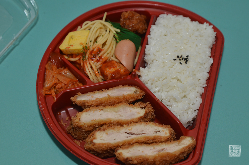 그리고 혜자롭게 돌아온 등심돈까스 구성을 보면 등심돈까스 4조각과 함께 밥, 소시지, 계란말이, 닭강정, 스파게티, 볶음김치, 어묵이 들어가 있었다. 모두 하나부터 열까지 학교에서 급식을 먹을 때 소위 잔반 없는 날에 나오는 반찬 구성이라 마음에 들었다. 이렇게 푸짐한 구성으로 5,200원에 밥 한 끼를 먹을 수 있다는 건 정말 혜자다.