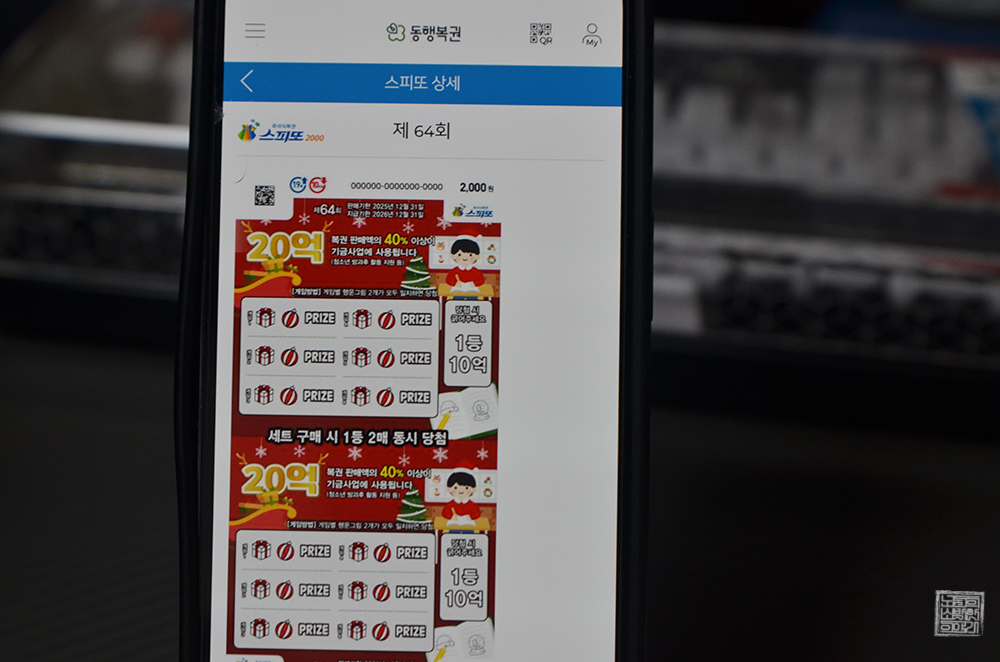 연말을 맞아 남은 잔돈으로 아직 상위등위가 많이 남은 스피또2000 64회를 구매할 것인지, 2026년 1월 1일부터 판매되는 새로운 스피또2000 65회를 구매할 것인지. 나는 일단 어머니와 함께 빚에 허덕이면서 사무실 일만 아니라 각자 부업을 하면서 버티고 있다 보니 일단 스피또2000 64회를 구매했다.