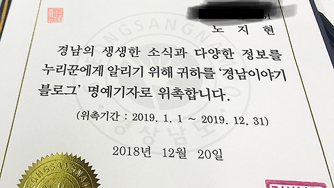 다시 시작한 경남 이야기 블로그 명예 기자 어제(20일) 오랜만에 경남도청을 다녀왔다. 내가 경남도청을 방문한 이유는 내년 1월부터 시작할 제11기 경남이야기 블로그 명예 기자 위촉장을 받기 위해서다. 과거 2013년에 제5기 경남 이야기 블로그 명예 기자로 활동한 적이 있는데, 무려 6년 만에 2019년을 맞아 활동을 다시 시작하게 되었다. 2013년에 활동을 한 이후 6년 동안 쉬었던 이유는 발목 부상 사고와 재활, 그리고 대학 생활을 병행하며 경남 이야기 블로그 명예 기자로 함께 하는 일이 쉽지 않았기 때문이다. 처음에는 블로그 글을 작성하는 일과 함께할 수 있지 않을까 싶었지만, 오로지 ‘경남’이라는 카테고리가 조금 걸렸다. 내가 사는 김해에서 볼 수 있는 특별한 문화 행사와 관광 요소를 소개하는..
